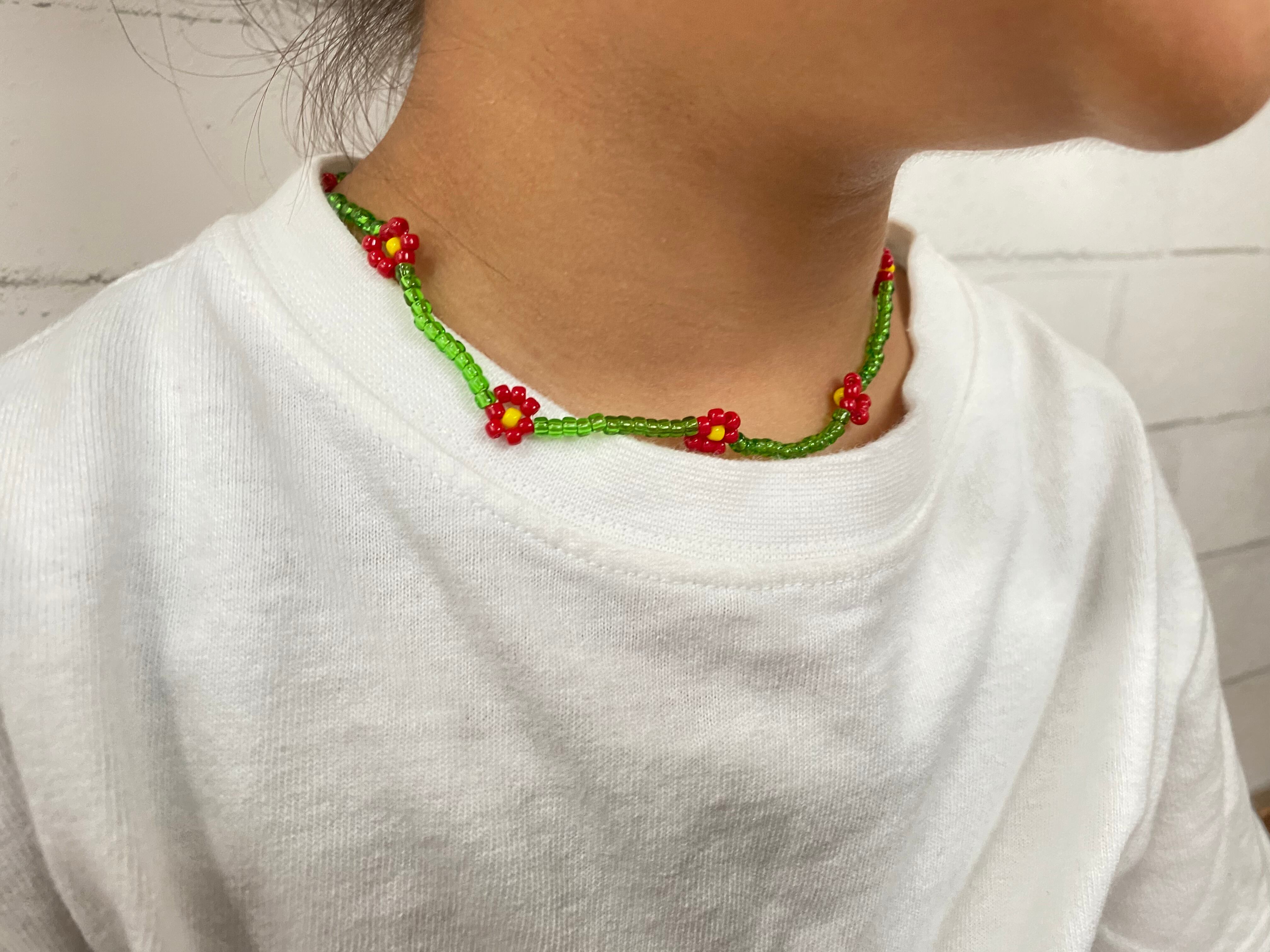 ◉グリーン×レッド×イエローのフラワービーズネックレスとなります。